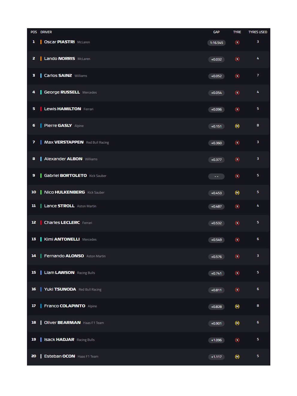 Es para destacar la labor de Alpine, con Gasly, quien deslumbró al finalizar en el sexto lugar, sacándole rédito a las mejores que trajo la escudería francesa en el A525. Franco Colapinto, que no contó con los retoques en el vehículo, cerró una buena primera prueba arriba del auto al culminar en el puesto 17.