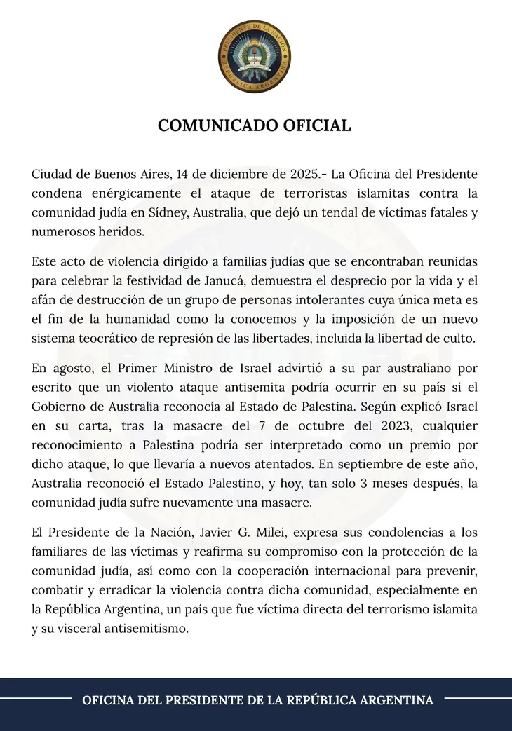 El Gobierno argentino repudió el ataque contra la comunidad judía en Sídney, expresó sus condolencias a las víctimas y reafirmó su compromiso con la lucha contra el terrorismo y el antisemitismo.