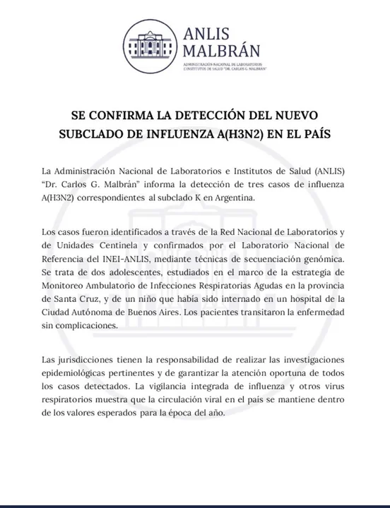 La Administración Nacional de Laboratorios e Institutos de Salud (ANLIS) "Dr. Carlos G. Malbrán" confirmó la detección de tres casos de influenza A (H3N2) correspondientes al subclado K en el país, identificados mediante técnicas de secuenciación genómica, según supo la Agencia Noticias Argentinas.