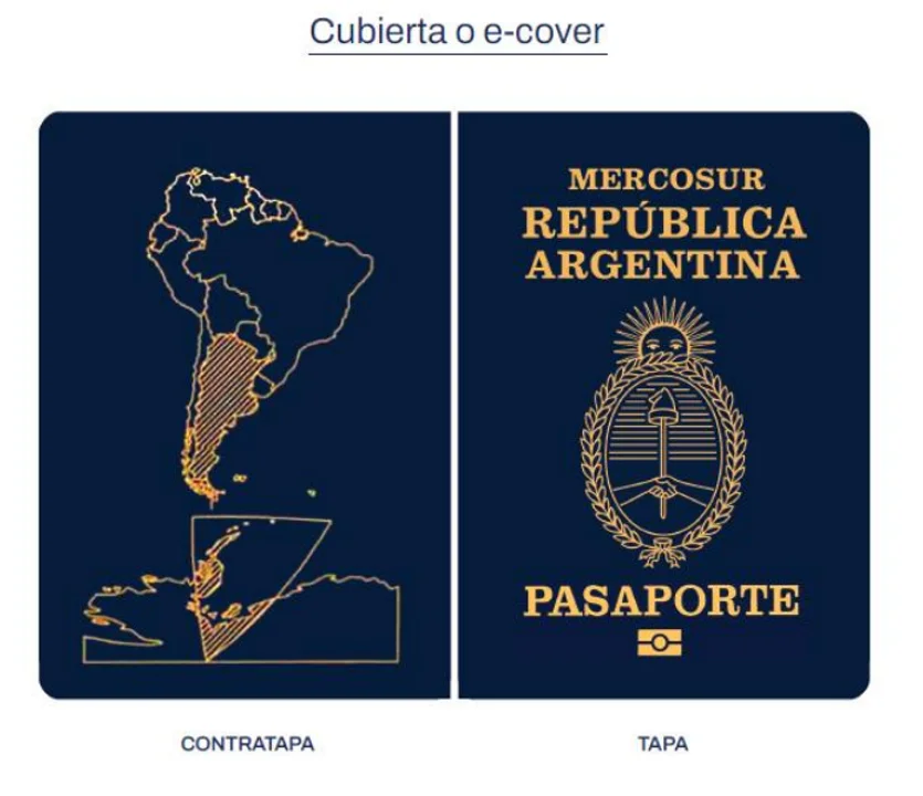En el sector central, aparecen impresas las leyendas "MERCOSUR" y "REPÚBLICA ARGENTINA", el Escudo Nacional, y por debajo de estos, la leyenda "PASAPORTE" y el símbolo internacional de pasaporte electrónico.
