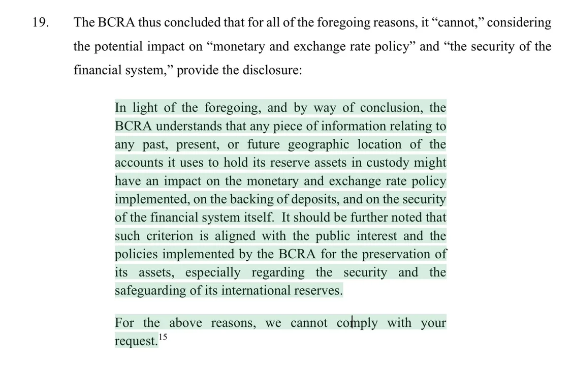 En cumplimiento de la orden judicial en Nueva York, el Gobierno ratificó la inmunidad de las reservas y advirtió que revelar su ubicación pondría en riesgo la "estabilidad financiera".