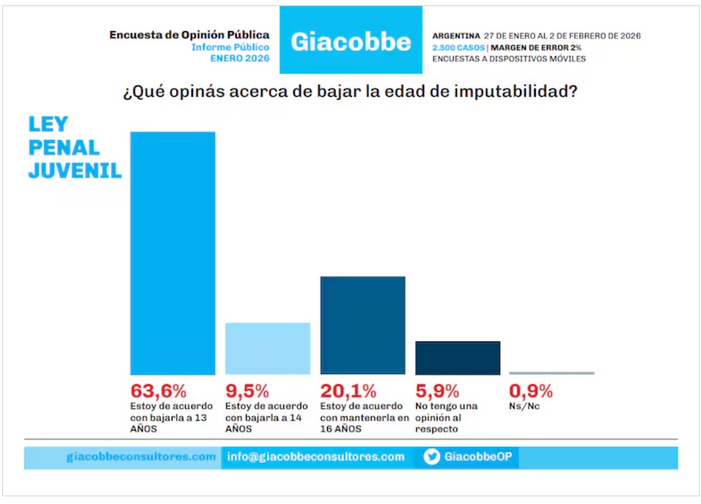 Otra medición, en este caso de Jorge Giacobbe, muestra un 73 % de respaldo al proyecto. Dentro de ese porcentaje, el 63,6% apoya que la edad se reduzca a 13 años - la propuesta original del Ejecutivo -, mientras que 9,5% se inclinan por fijarla en 14, la edad consensuada con bloques aliados.
