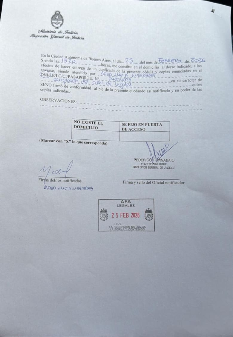 La resolución sobre el cambio de jurisdicción fue firmada por la Directora Provincial de Personas Jurídicas bonaerense, Silvia Andrea García, a las 15:04. Dos horas y media antes, cerca de las 12:30, la IGJ ya había notificado a las autoridades de la AFA.