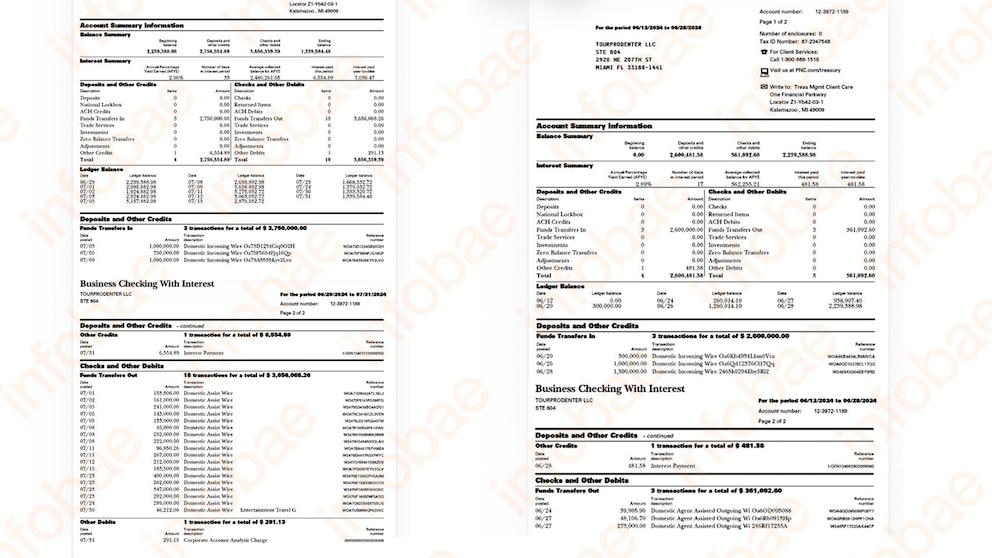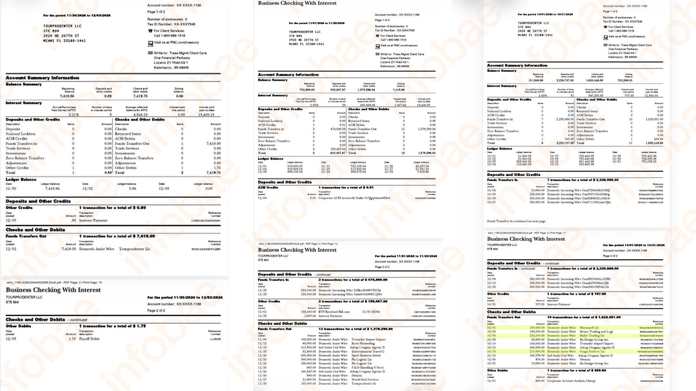 Registros bancarios obtenidos a través de órdenes judiciales en Estados Unidos revelan que, en menos de un año, por esa cuenta circularon USD 13.554.200,64. La cuenta en PNC Bank se fondeaba mediante transferencias de empresas asociadas a contratos internacionales -entre ellas STAR RIGHTS LIMITED, COTTI COFFEE INTERNATIONAL LIMITED, SOCIOS TECHNOLOGIES AG, WISE US y otras firmas del exterior- y a través de movimientos internos desde otras cuentas de la propia Tourprodenter.