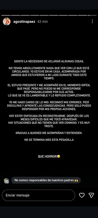 "No tengo absolutamente nada que ver con lo que está circulando. Yo estuve en mi casa acompañada por amigos que estuvieron a mi lado todo este tiempo. Él (su padre) estuvo presente y me acompañó en el momento difícil que pasé. No puedo ni me corresponde responsabilizarme por sus actos", expresó la joven de 29 años.
