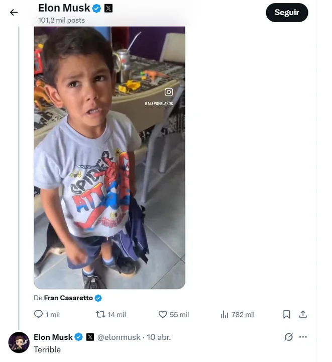 "Terrible", fue lo que manifestó Musk en un video publicado por una usuaria de la red social X, en el que habla sobre el caso del pequeño que murió en la ciudad chubutense y del feminismo, supo la Agencia Noticias Argentinas.