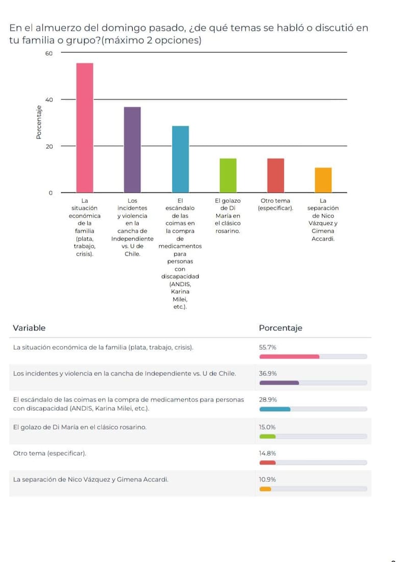 Este estado de descomposición interna es el menos conveniente para un gobierno expuesto a un desafío electoral. La consultora Rubikon Intel realizó una encuesta veloz bastante original. Preguntó a 1200 personas de todo el país de qué había hablado con su familia o sus amigos durante el almuerzo del último domingo. Un 55,7% dijo que la conversación giró en torno de la situación económica. El 36,9% habló sobre los incidentes del partido de Independiente contra Universidad de Chile. Del escándalo sobre presuntas coimas en el Gobierno habló el 28,9% de los consultados. El 14,8% conversó sobre un tema sin identificar y sólo el 10,9% lo hizo sobre el divorcio de Nico Vázquez y Gimena Accardi. En la misma encuesta, La Libertad Avanza sería la fuerza más votada, con 36,8%. Un 28,6% no sabe o no contesta. Fuerza Patria se lleva 18,5% y el voto en blanco, 12,1%.