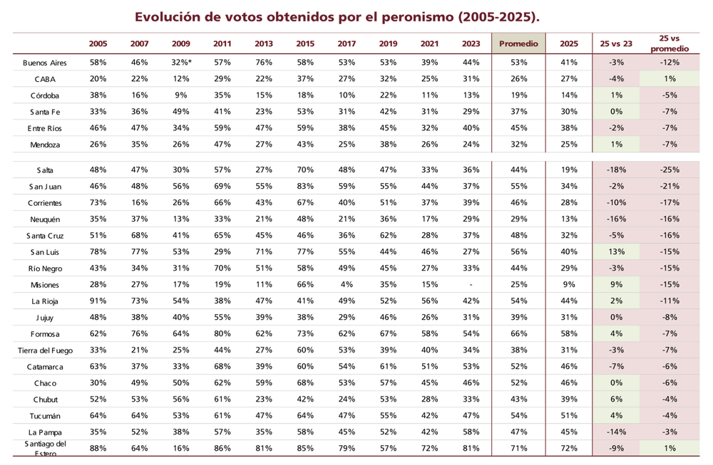 La conclusión es contundente: "El peronismo se desangra, retrocede, pierde votos, identidad y territorio". Aunque advierte que "dada la profundidad de sus raíces, está lejos de convertirse en un actor minoritario en la política argentina". Y resume: "Pero el deterioro es evidente"