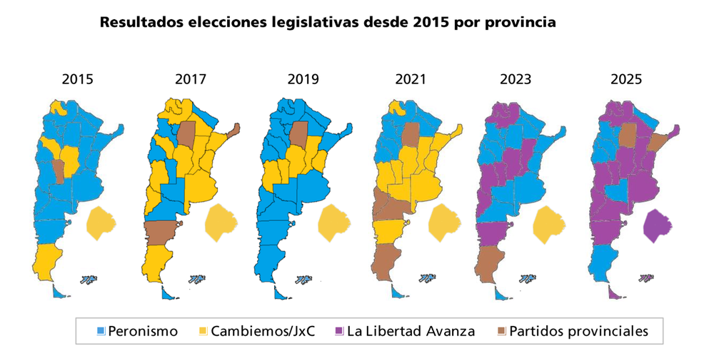 Desde otra consultora, Barda, también llegaron a las mismas conclusiones que Poliarquía y Ad Hoc. Sobre el peronismo, aseguran que "acumuló una serie de cinco derrotas legislativas consecutivas en elecciones intermedias nacionales desde 2005". Y detallan: "Las derrotas de 2009 y 2013 ocurrieron en un contexto de oposición fragmentada y territorializada: distintas fuerzas le ganaban al oficialismo en distintos distritos, sin una expresión nítidamente unificada a nivel nacional. En cambio, las derrotas de 2017, 2021 y 2025 comparten un rasgo clave: el peronismo fue vencido por una alternativa única y nacionalizada. Cambiemos/JxC primero, LLA ahora".