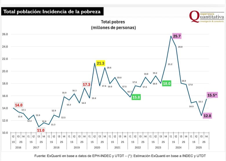 "La pobreza ha vuelto a crecer en la Argentina, luego de seis trimestres consecutivos en reducción", afirmó ExQuanti en su informe, y agregó: "Durante el cuarto trimestre de 2025 se interrumpió la tendencia a la baja. Entre los últimos dos trimestres de 2025, la cantidad de pobres habría aumentado en 2,7 millones de personas".