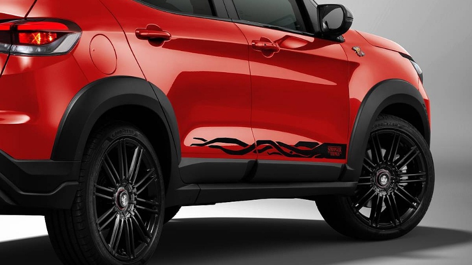 Los aspectos más destacados del diseño exterior, según Mega Autos, incluyen una calcomanía con la marca de la garra de un Demogorgon. La versión Vulcano Black presenta detalles en rojo en las tomas de aire, la placa protectora y los espejos, mientras que la opción Montecarlo Red de dos tonos invierte este esquema de color. Los "easter eggs" serigrafiados en las ventanas y una placa especial del motor se suman al diseño único.