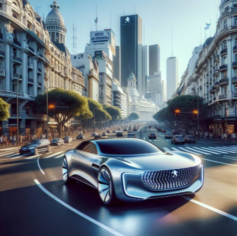 La primera imagen del Peugeot 504 modelo 2025 que genera la IA de Copilot lo muestra tomando velocidad en una avenida céntrica de una ciudad que bien podría ser Buenos Aires. La carrocería está diseñada con suaves líneas que acompañan el espíritu moderno del vehículo, con una mirada más actualizada. Se trata de una variante coupé del conocido modelo, que en este caso es de color gris plateado. En la parrilla, el logo del león característico de Peugeot está fijo sobre la rejilla, que a los costados tiene encendidos dos poderosos faros delanteros, de los que parten franjas de iluminación LED.