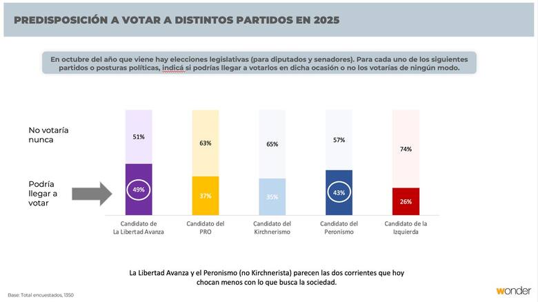 En otro gráfico de Wonder, con foco en las elecciones legislativas del próximo mes de octubre, se observa que un 49% votaría por un candidato de La Libertad Avanza, mientras que sólo un 4% apoyaría al peronismo. Esto es crucial porque refleja que La Libertad Avanza lidera frente a la oposición y polariza con un peronismo que, bajo el mando de Cristina Kirchner, sigue siendo la principal fuerza opositora.