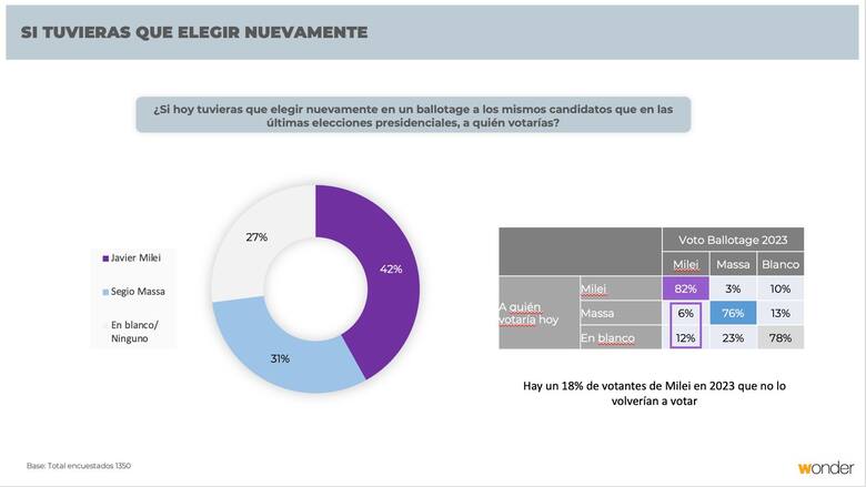 Este es el panorama al que se enfrenta un gobierno que, paradójicamente, tiene noticias positivas para compartir. Estas contrastan con la ausencia de novedades en el resto del ámbito político, tanto en la oposición como entre los aliados del oficialismo. Nuevamente la consultora Wonder logra ilustrar este panorama. Según una encuesta sobre el comportamiento actual de los que votaron en el ballotage, Javier Milei sigue liderando con el 42% de intención de voto, mientras que Sergio Massa obtiene un 27% y el voto en blanco también tiene un porcentaje relevante.