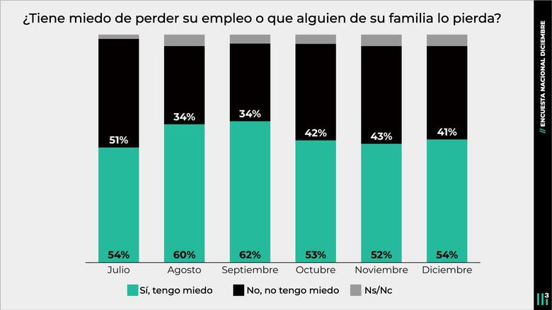 En la misma sintonía, un gráfico producido por Casa 3 de Mora Jozami, muestra que el 54% de los argentinos tienen miedo a perder su trabajo.