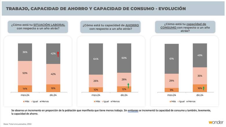 Por otro lado, la problemática del empleo sigue creciendo. Según la consultora Wonder, de Carolina Yellati, los argentinos ven deteriorada su situación laboral: un 42% asegura que su empleo empeoró respecto al año pasado.