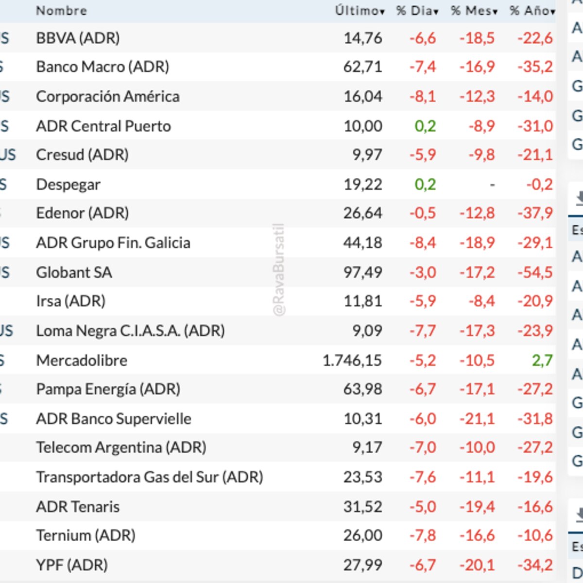 Entre los ADR y acciones de compañías argentinas negociadas en dólares en Wall Street se imponían profundas caídas, encabezadas por Grupo Galicia (-8,4%), Corporación América (-8,1%) y Ternium (-7,8%).