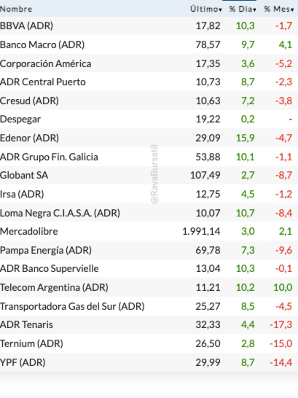 Entre los ADR y acciones de compañías argentinas negociadas en dólares en Wall Street se imponen las alzas, encabezadas por Edenor (+15,9%), Loma Negra (+10,7%), Banco Supervielle (+10,3%), Banco Francés (+10,3%), Telecom (+10,2%), Grupo Galicia (+10,1%) y Banco Macro (+9,7%).
