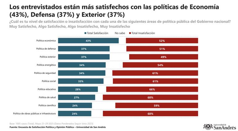 La encuesta de satisfacción política y opinión pública, realizada entre el 21 y el 29 de mayo por el Laboratorio de Observación de la Opinión Pública de la universidad, relevó 1005 casos de adultos de 18 años en adelante, con conexión a internet. En el estudio, para la consulta "En general, ¿Aprobás o desaprobás al gobierno del presidente Javier Milei?", se concluyó que "el 49% aprueba" y que "el 48% lo desaprueba".