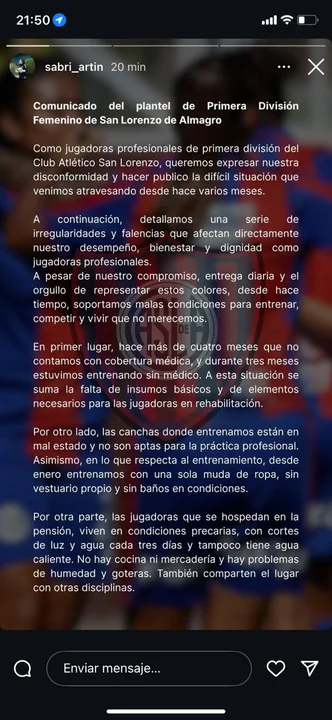 El fútbol femenino profesional de San Lorenzo volvió a alzar la voz, esta vez fue el plantel de Primera División quien emitió un extenso y contundente comunicado para denunciar la crítica situación que atraviesan dentro del club.