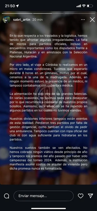 A esto se suman problemas logísticos graves: viajes en micros en mal estado, demoras de horas en llegar a los destinos, falta de alimentación y ausencia total de viandas incluso en partidos oficiales.