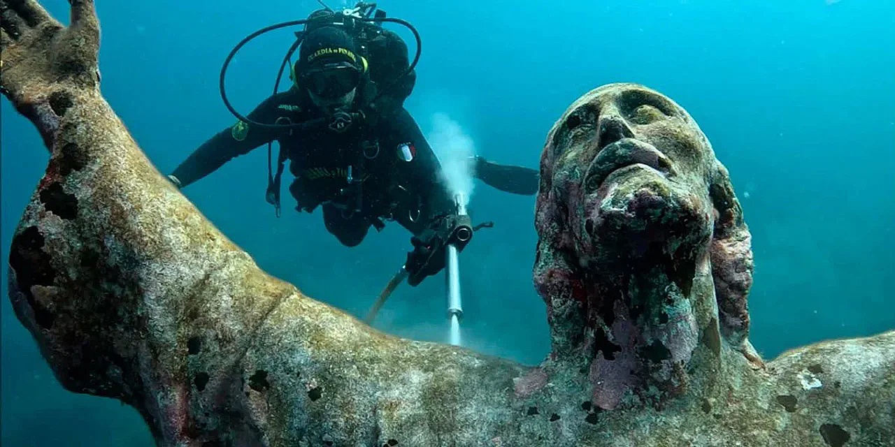 Tras décadas de limpiezas abrasivas, expertos aplicaron nuevas técnicas para restaurar la emblemática estatua sumergida en la bahía de San Fruttuoso.