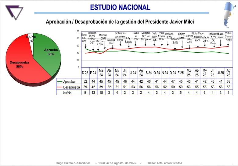 Estudio de Hugo Haime que midió la aprobación y desaprobación del Gobierno en agosto 2025