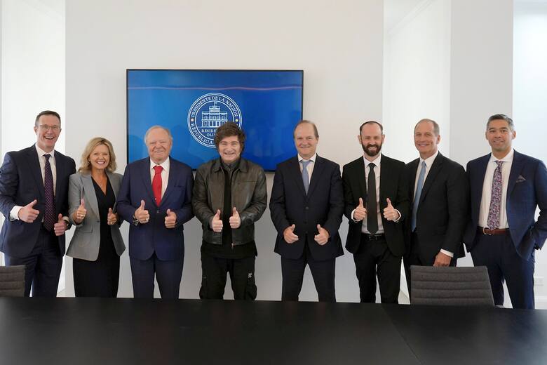 El Presidente Javier Milei y el Secretario Coordinador de Energía y Minería, Daniel González, esta mañana en la Residencia de Olivos con el fundador y directivos de la empresa de exploración y producción de petróleo y gas norteamericana, Continental Resources.