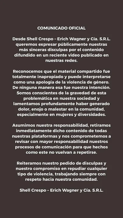 En su comunicado, la firma asumió su responsabilidad y lamentó "profundamente haber generado dolor, enojo o malestar en la comunidad". Reconocieron que el video "puede interpretarse como una apología de la violencia de género" y aseguraron que "de ninguna manera esa fue nuestra intención".