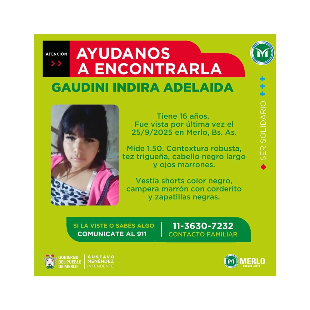 Indira Adelaida Gaudini, una adolescente de 16 años, es buscada intensamente desde hace más de 48 horas después de que salió de su casa de la localidad de Parque San Martín, partido bonaerense de Merlo, para ir a visitar a una amiga.