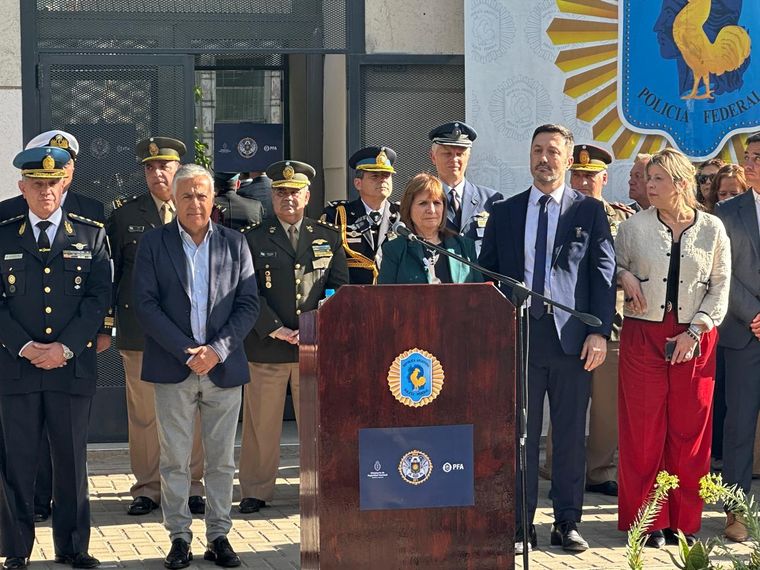 La ministra de Seguridad Patricia Bullrich visitó este lunes la provincia de Mendoza, donde encabezó una serie de actos junto a funcionarios locales y su par de Defensa, Luis Petri.