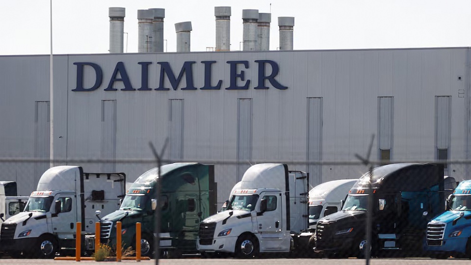 Un hombre trabaja en un camión de carga en la planta de ensamblaje de camiones Daimler Freightliner en Derramadero, Coahuila, México