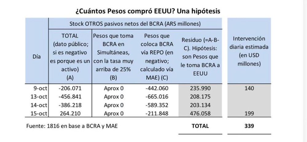 Cuánto lleva poniendo sobre la mesa EEUU para estabilizar el dólar empieza a trascender. "Basándonos en información pública, estimamos que el Tesoro estadounidense compró pesos por un monto equivalente a alrededor de US$ 140 millones el jueves pasado y a alrededor de US$ 199 millones ayer miércoles, un total de aproximadamente US$ 339 millones entre esas dos jornadas. No contamos aún con información para estimar la intervención de hoy (por el jueves), dado que usamos datos que vienen con 1 rueda de demora", dice la consultora 1816, una de las más leídas en la City porteña.