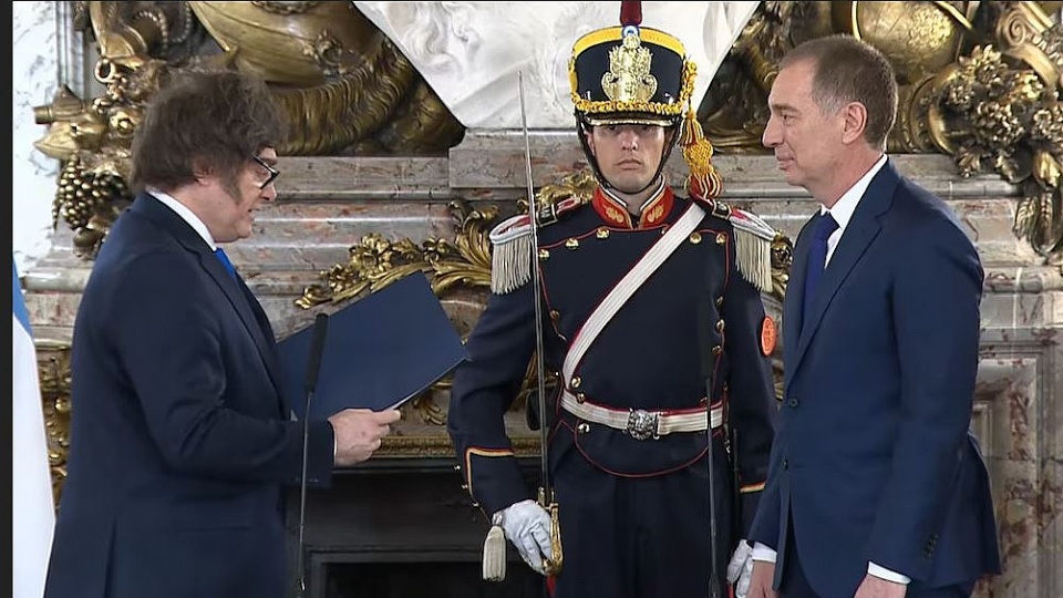 El presidente Javier Milei le tomó juramento este martes a Diego Santilli como nuevo ministro del Interior en un acto que contó con la presencia de familiares, amigos y dirigentes cercanos al "Colo", entre los que había figuras cercanas al PRO. La jura se llevó a cabo en el Salón Blanco de la Casa Rosada durante esta tarde.