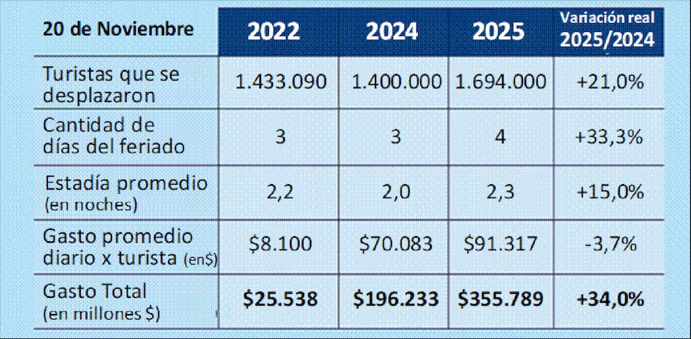 Más de 1,6 millones de turistas se movilizaron por Argentina durante el fin de semana largo de noviembre por el Día de la Soberanía Nacional, lo que representó un incremento del 21% respecto al mismo feriado del año anterior, según datos de la Confederación Argentina de la Mediana Empresa (CAME). El gasto total estimado alcanzó los $355.789 millones, un 34% más en términos reales que en 2024, impulsando la economía de los principales destinos turísticos del país.