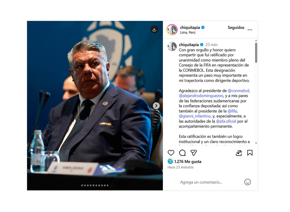 La máxima autoridad de AFA eligió sus redes sociales para celebrar el respaldo en Conmebol: "Con gran orgullo y honor quiero compartir que fui ratificado, por unanimidad, como miembro pleno del Consejo de la FIFA en representación de la CONMEBOL. Esta designación representa un paso muy importante en mi trayectoria como dirigente deportivo. Agradezco al presidente de Conmebol, Alejandro Domínguez, y a mis pares de las federaciones sudamericanas por la confianza depositada, así como también al presidente de la FIFA, Gianni Infantino, y, especialmente, a las autoridades de la AFA por el acompañamiento permanente".