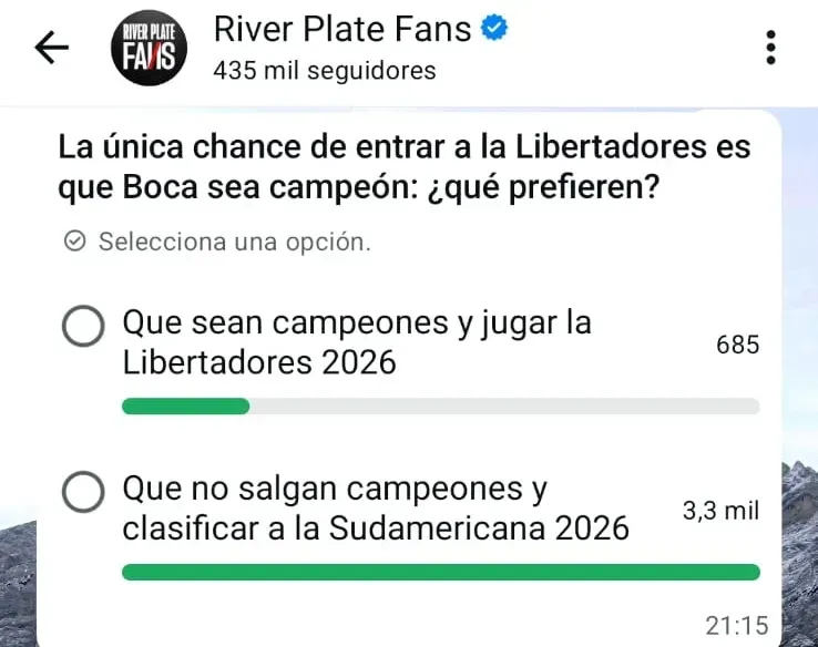Una ver terminado el partido entre Boca y Argentinos Juniors, Bolavip planteó una encuesta en su canal de WhatsApp para hinchas de River y los invitó a votar. La pregunta eran sencilla, preferían que el Xeneize salga campeón del Clausura y jugar la Libertadores 2026 o ir a la Copa Sudamericana, pero que el rival de toda la vida no gane el campeonato.