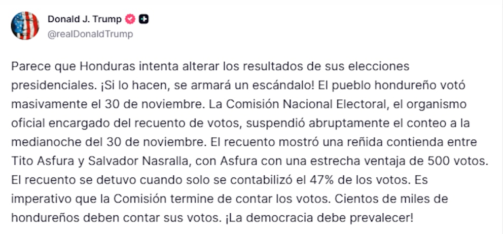 "Parece que Honduras intenta alterar los resultados de sus elecciones presidenciales. ¡Si lo hacen, se armará un escándalo! El pueblo hondureño votó masivamente el 30 de noviembre. La Comisión Nacional Electoral, el organismo oficial encargado del recuento de votos, suspendió abruptamente el conteo a la medianoche del 30 de noviembre. El recuento mostró una reñida contienda entre Tito Asfura y Salvador Nasralla, con Asfura con una estrecha ventaja de 500 votos. El recuento se detuvo cuando solo se contabilizó el 47% de los votos. Es imperativo que la Comisión termine de contar los votos. Cientos de miles de hondureños deben contar sus votos. ¡La democracia debe prevalecer!", posteó Trump.