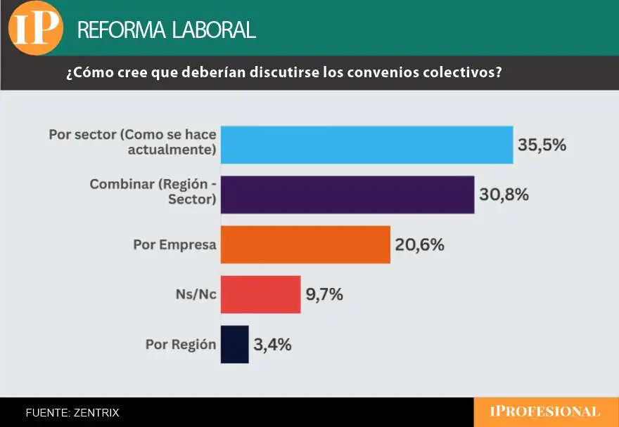 La encuesta preguntó cómo deberían discutirse los convenios colectivos y dio opciones. El 35,5% de los consultados consideró que debe resolverse "por sector (como se hace actualmente)", mientras que el 30,8% consideró que se debe tener en cuenta el sector y también la región del país. En tanto, la alternativa de que se defina "por empresa" reunió apenas el 20,6% de apoyo.