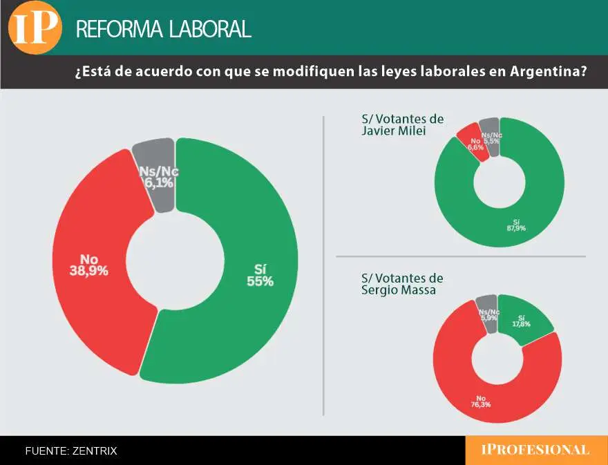 En primer lugar, la encuesta arrojó que el 55% de los consultados está "de acuerdo con que se modifiquen las leyes laborales", mientras que el 38,9% se expresó en contra y 6,9% indefinido. Entre los votantes de Milei el apoyo a la iniciativa fue del 87,9% pero la sorpresa se da con los que eligieron a Massa en 2023, donde un significativo 17,8% se mostró a favor de una reforma.