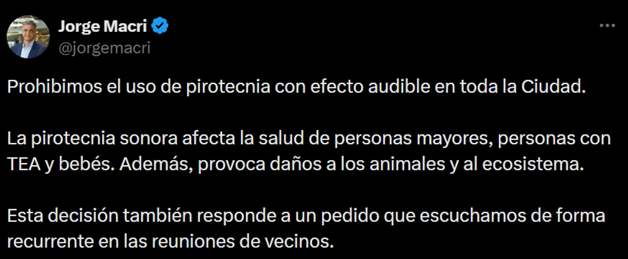 A través de un posteo en su cuenta de la red social X, Macri remarcó: "Prohibimos el uso de pirotecnia con efecto audible en toda la Ciudad".