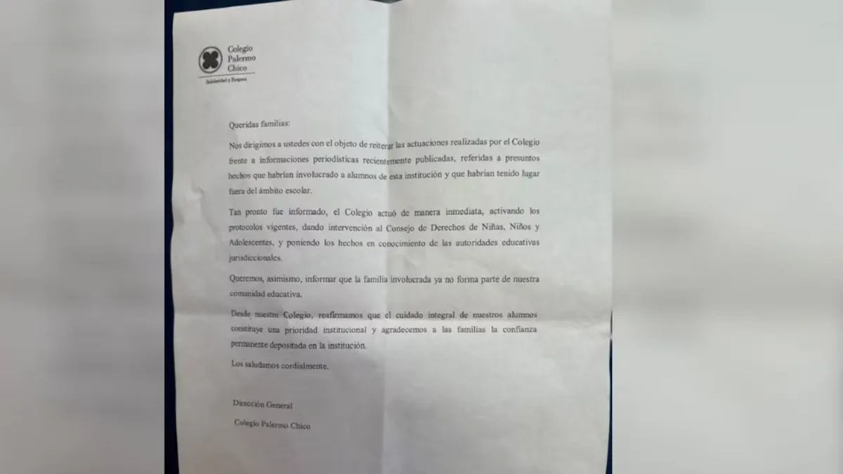 Finalmente, concluyeron con la novedad: "Queremos, asimismo, informar que la familia involucrada ya no forma parte de nuestra comunidad educativa. Desde nuestro Colegio, reafirmamos que el cuidado integral de nuestros alumnos constituye una prioridad institucional y agradecemos a las familias la confianza permanente depositada en la institución. Los saludamos cordialmente. Dirección General Colegio Palermo Chico".