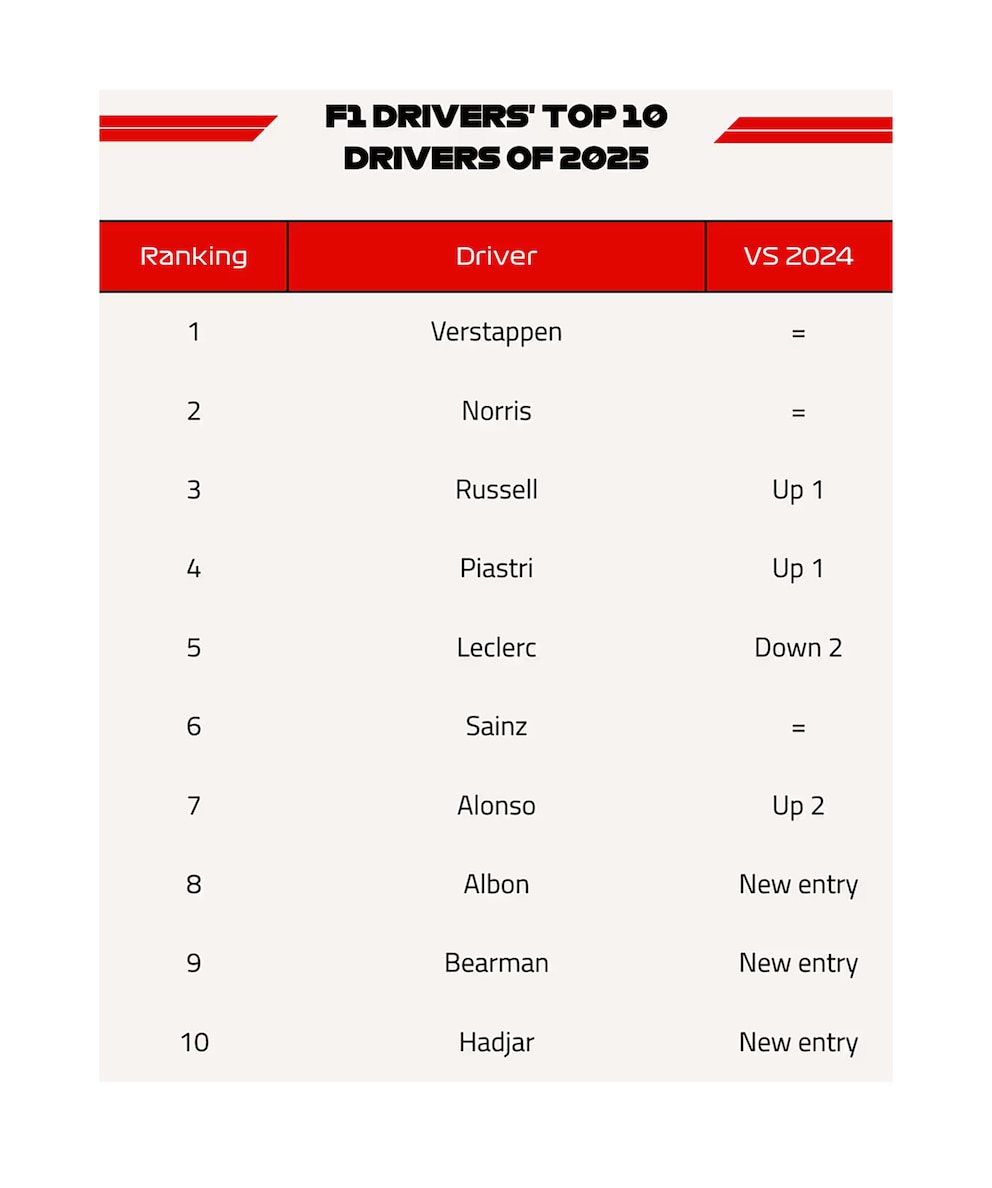 Un aspecto a remarcar es que por primera vez desde la creación de la votación interna (2018), Lewis Hamilton quedó fuera del grupo de destacados, una situación que sobresale en una lista que tradicionalmente reconoce a los nombres más establecidos del paddock. El informe del sitio de la F1, firmado por el analista Lawrence Barretto, también remarcó que el francés Pierre Gasly no alcanzó el top 10 luego de combatir con las complicaciones en pista que mostró el A525 de Alpine. Su compañero, el argentino Franco Colapinto, también quedó fuera de la decena de pilotos más votados por sus colegas.