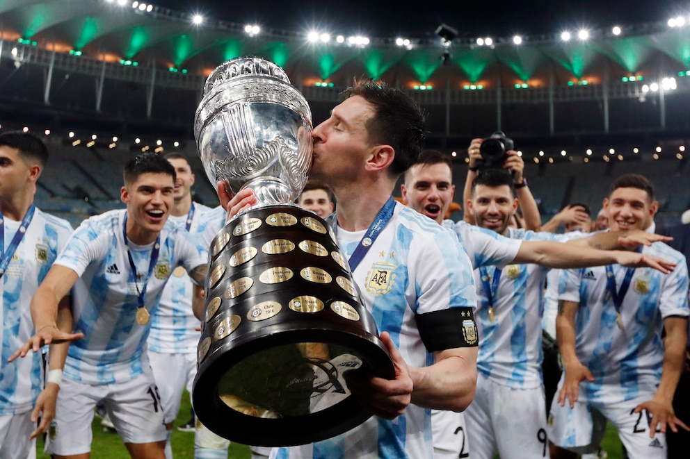 El beso de Lionel Messi a la Copa América 2021 después de vencer a Brasil en la final.