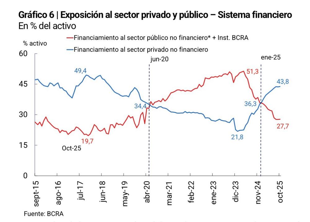 El fenómeno más relevante del informe es lo que el BCRA denomina "crowding in", un proceso mediante el cual los bancos incrementaron su exposición al sector privado en detrimento del financiamiento al sector público. Los números son contundentes: el crédito al sector privado representó 43,8% del activo bancario en octubre de 2025, lo que implica un aumento de 13,6 puntos porcentuales en términos interanuales. En simultáneo, la exposición al sector público cayó hasta 27,7%, una reducción de 11 puntos porcentuales en el mismo período.
