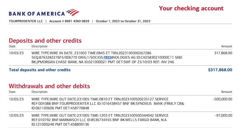 El 3 de octubre de 2023, en la cuenta de TourProdEnter del Bank of America ingresó una transferencia de US$317.868 de Socios Technologies