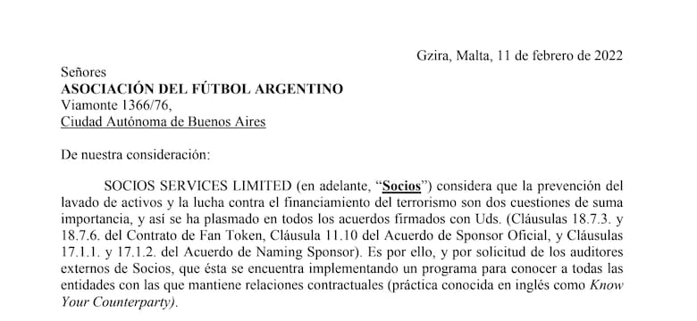 En febrero de 2022, Socios.com le mandó una nota a la AFA a pedido de sus auditores externos.