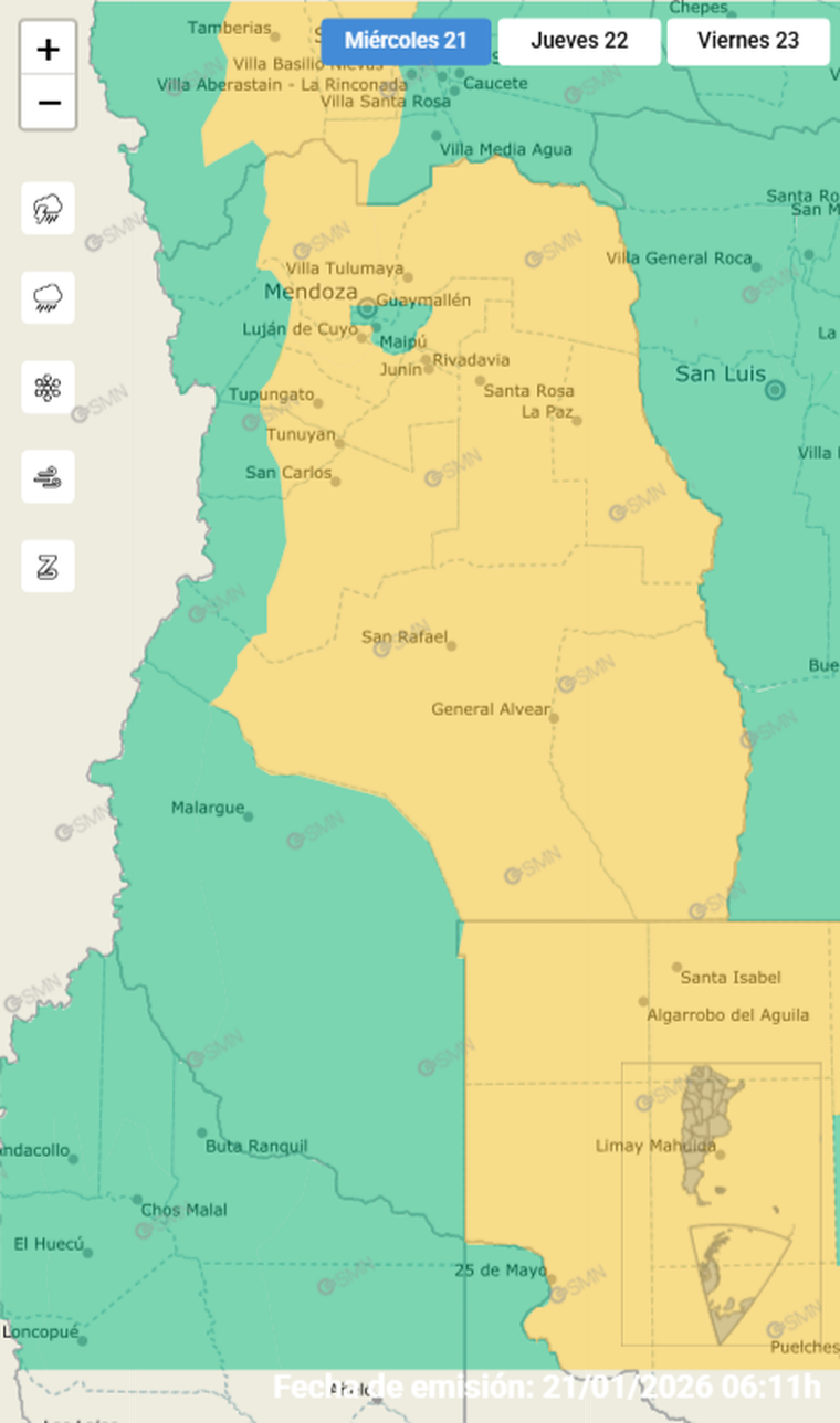 Jueves 22 de enero: continuará el calor, con nubosidad variable y tormentas aisladas. Se espera circulación leve del norte entre las 8 y las 20, con inicio de convección desde las 14 en el Oeste del Gran Mendoza, avanzando hacia el Valle de Uco. En San Rafael y General Alvear podrían registrarse tormentas más intensas, con probabilidad de granizo. Máxima: 35°C | Mínima: 18-22°C (según zona).