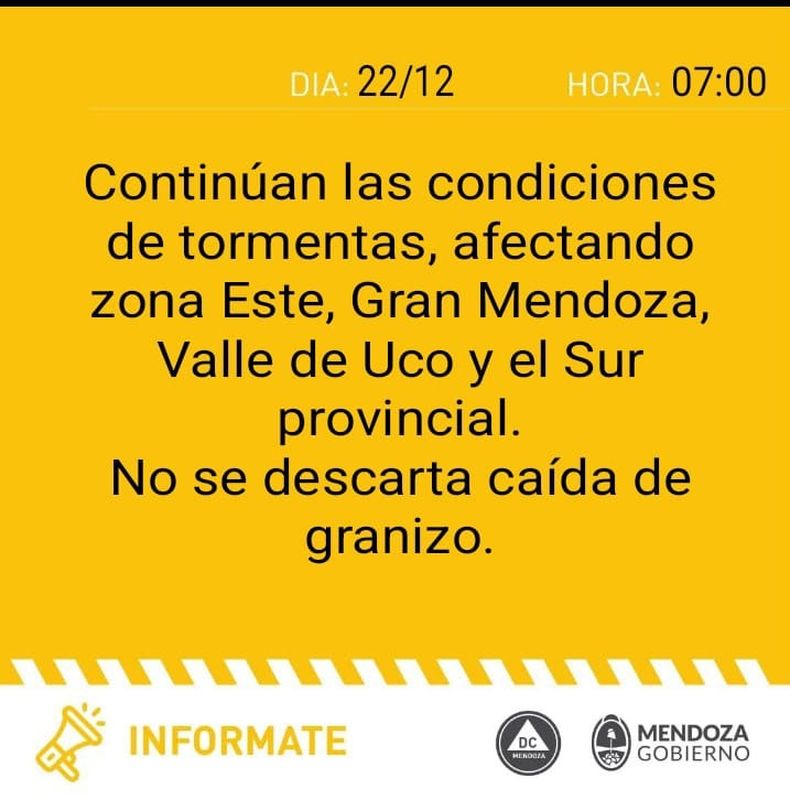 Hacia la tarde comenzarán a soplar vientos del sector sur, un cambio que marcará la llegada de tormentas a gran parte de Mendoza sobre todo en horas de la noche. El sistema de alerta temprana del Servicio Meteorológico Nacional emitió una alerta amarilla para General Alvear, San Rafael, Tunuyán, Tupungato, San Carlos, Santa Rosa, La Paz, Junin, San Martín, Luján de Cuyo, Lavalle y Las Heras.