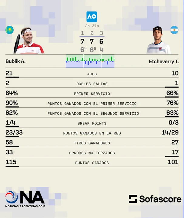 Pese a la derrota, Etcheverry, que ocupa el puesto número 62 del ranking, jugó en un altísimo nivel y pudo mantener todos sus turnos de saque para forzar el tie-break en los dos primeros parciales, aunque en dichas "muertes súbitas" el kazajo hizo pesar toda su jerarquía para que la moneda cayera a su favor.